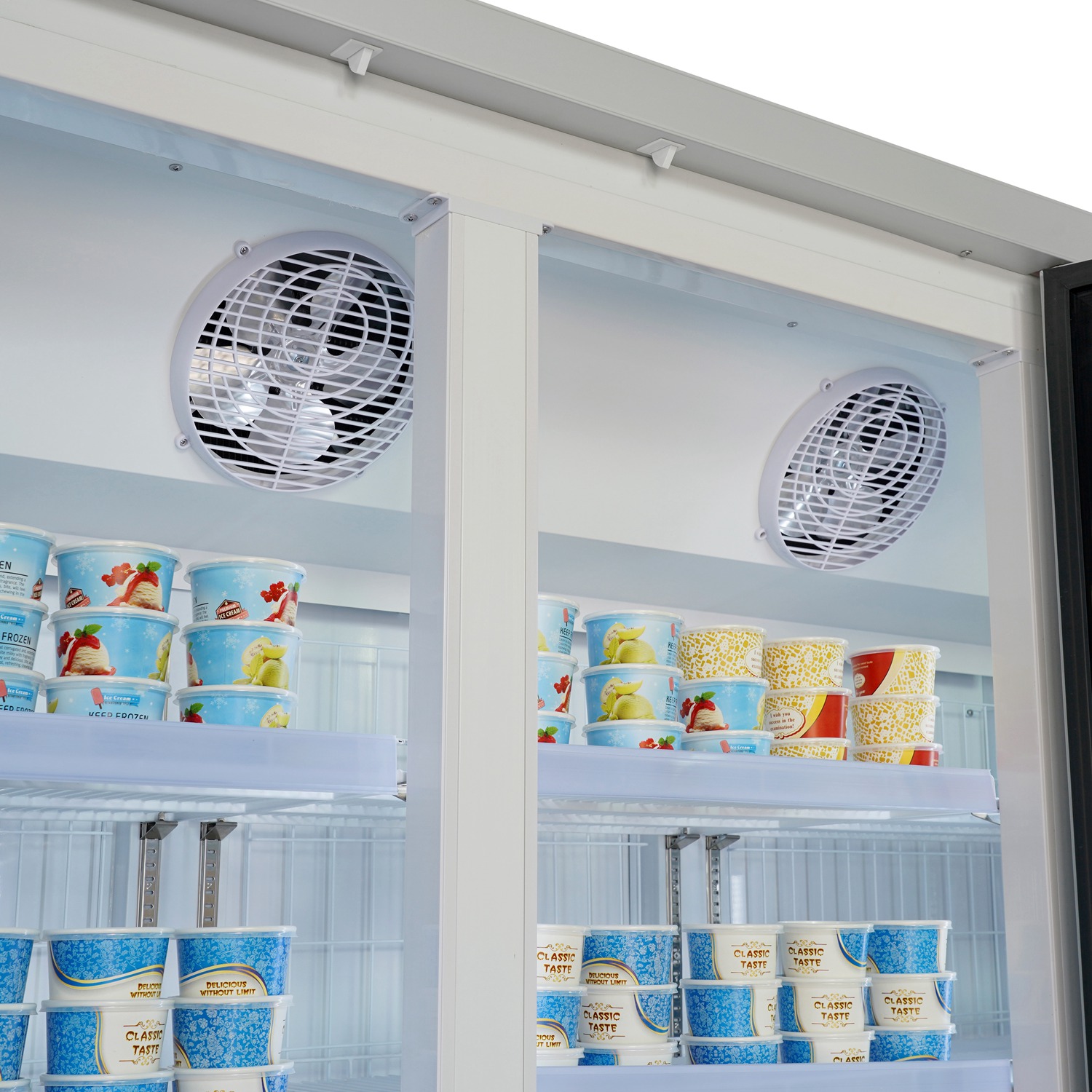 Our commercial freezers are equipped with an advanced fan cooling system, which ensures rapid and uniform temperature distribution throughout the cabinet. Unlike traditional static cooling (direct cooling) systems, the fan-assisted design can quickly reduce the internal temperature to the desired level—typically within 2 to 8 minutes—depending on ambient conditions and settings.