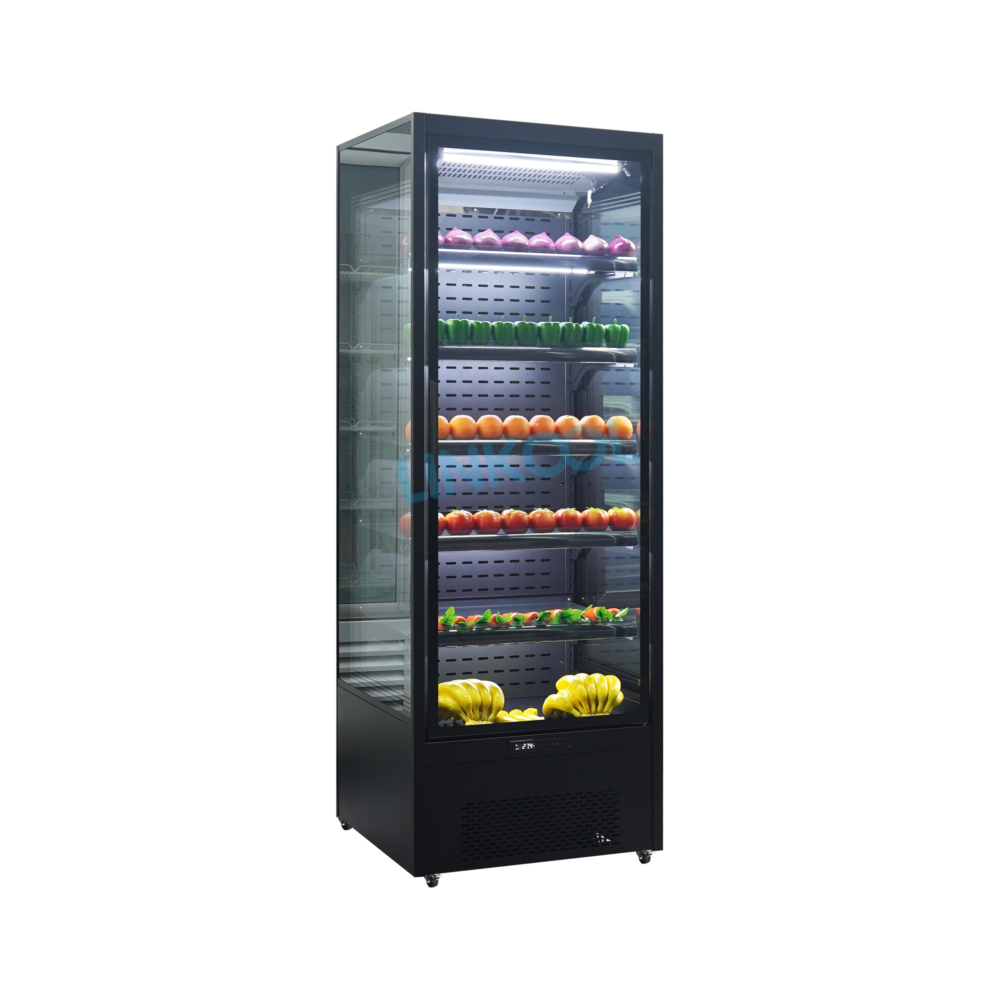 Featuring a clear glass door design, this air open refrigerator reduces energy loss while keeping products